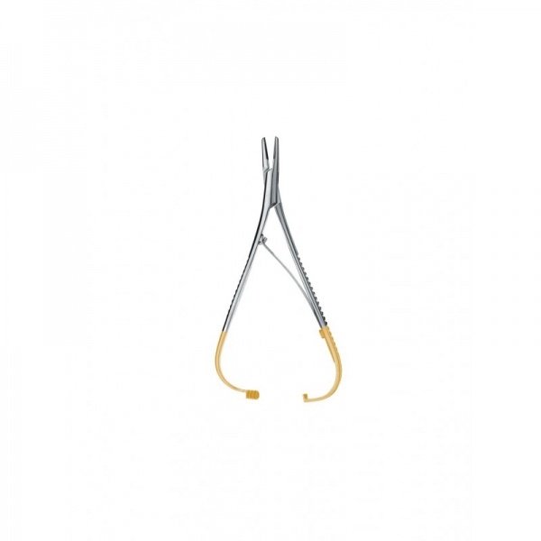 Рабочие части иглодержателя имеют стандартный вид, суженный к концу и закругленный. Промежуточная часть переходит в рукоятки, покрытые поперечными углублениями предотвращения скольжения в руке. На внутренней поверхности браншей имеется обращенная к рабочей части разводная пластиночная пружина. Рукоятки заканчиваются плавным изгибом в 90 градусов по ребру, и переходят в нажимной трехступенчатый фиксатор. Общая длина инструмента не более 140 мм