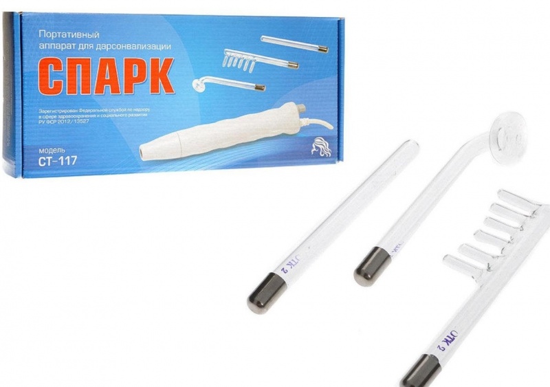 Физиотерапевтический прибор Спарк СТ 117 помогает лечить многие заболевания, а также решать косметические, дерматологические и хирургические проблемы, включая угревую сыпь, облысение и бородавки. Дарсонвализация улучшает обмен веществ, повышает тонус органов, снимает местное воспаление, а также оказывает бактерицидное и обезболивающее действие. Соответствие рабочих параметров стандартному дарсонвалю позволяет задействовать Спарк СТ 117 в качестве мощного профессионального или домашнего аппарата при различных гнойно-воспалительных болезнях, недугах опорно-двигательного аппарата, кожных покровов и ЛОР-органов. Устройство официально зарегистрировано как медицинский прибор. Воздействует на организм посредством слабых токов (0,02мА) с переменными электрическими импульсами большой частоты и напряжения (20 кВ).