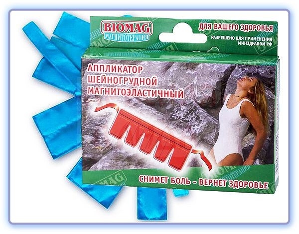 Аппликатор шейно-грудной магнитоэластичный изготовлен по специальной технологии. В аппликаторе используется постоянное магнитное поле создаваемое эластомагнитами, которые установлены в кармашках-ячейках. Магнитная сторона эластомагнитов обращена к телу человека. Магнитная индукция эластомагнитов: 35 мЛт. Магнитные свойства сохраняются в течение 7 лет.