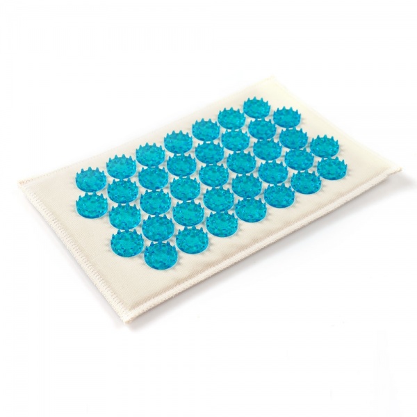 Тибетский иппликатор малый массажный коврик 12 x 22 см синий представляет собой натуральную хлопчатобумажную ткань, на которой с помощью термической напайки закреплены 37 синих иппликаторных модуля. Иглы иппликаторных модулей имеют двойное острие в соответствии с древнекитайским методом "Цветок сливы". Двойное острие препятствует глубокому проникновению игл в кожу, делает лечебную процедуру менее болезненной и одновременно более эффективной.