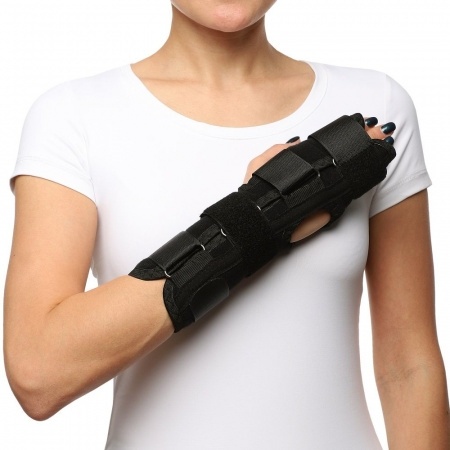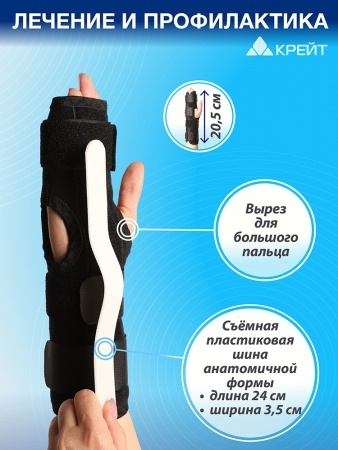 - Имеет съемную пластиковую шину анатомической формы по ладонной поверхности длиной 24 см, которая исключает сгибание в лучезапястном суставе