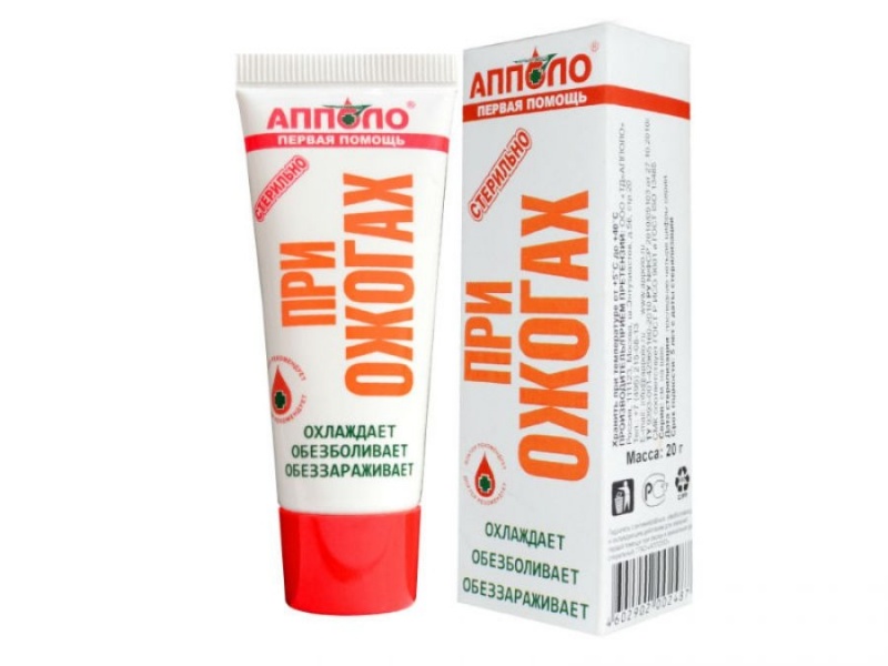 Гидрогель при ожогах "АППОЛО" - эффективное средство для оказания первой помощи при любых ожогах (химических, термических, солнечных). Гидрогель применяется на любой стадии ожогового процесса и обладает целым рядом уникальных характеристик. Гидрогель при ожогах удобен не только, как средство первой помощи от ожогов, но и в лечении глубоких и обширных ожогов. Основой препарата является инновационный гидрогель с введенными в его состав препаратами: йодовидоном (антисептиком) и анилокаином (анестетиком). Противоожоговый гель упакован в тубу 20 грамм из материала с высокими барьерными свойствами, стерилизован.