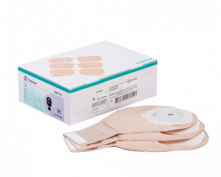 Непрозрачная дренируемая система для илеостомы с двухсторонней подложкой и встроенной застежкой.