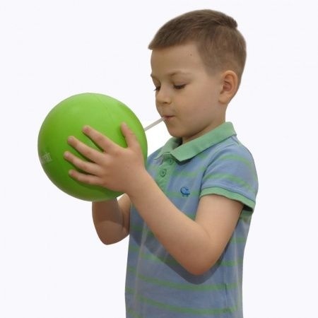 - Мяч следует надувать ртом, через специальную трубочку, которая идет в комплекте. Необходимо сделать глубокий вдох носом и медленный выдох в трубочку. Выдох должен быть в 2-3 раза продолжительнее вдоха