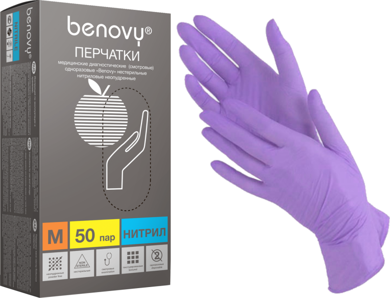 Одноразовые перчатки Benovy размера L выполнены из нитрила, благодаря чему обеспечивают полное облегание рук с сохранением тактильных ощущений. Гипоалергенны. Рабочая поверхность перчаток имеет выраженную текстуру, которая обеспечивает надежный захват и удержание инструментов в условиях повышенной влажности. Перчатки можно использовать при бытовых работах, обработке продуктов питания, также при косметологических процедурах. Перчатки поставляются в картонной упаковке. Количество в упаковке: 50 пар. Имеется регистрационное удостоверение на медицинское изделие.