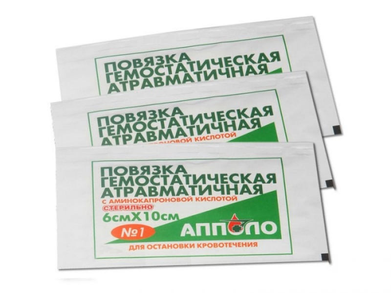 Повязка гемостатическая атравматическая "АППОЛО" выполнена из двухслойного нетканого атравматичного полотна, пропитанного 5% раствором аминокапроновой кислоты.
