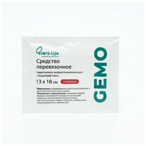 «ЭверсЛайф-Гемо» представляет собой салфетку, пропитанную биологически активным низковязким гидрогелем на основе хитозан-желатинового полиэлектролитного комлекса с иммобилизованными фармсубстанциями аминокапроновой кислоты, кальция глюконата, лидокаина и хлоргесидина, нанесенный на салфетку из нетканого полотна размером 18 х 13 см.