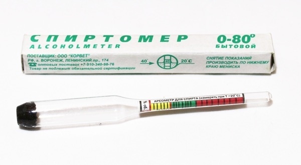 Для измерения спиртомер необходимо поместить в узкую ёмкость небольшого объема. Измерительный прибор должен сохранять вертикальное положение, напоминая рыболовный поплавок, и не касаться стенок сосуда.