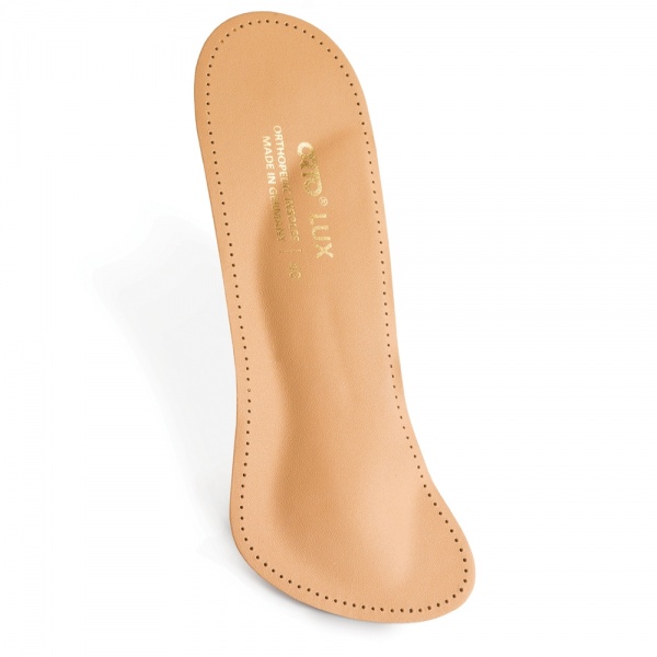 Бескаркасные ортопедические полустельки для модельной обуви. Имеют смягчающую вставку в области внутреннего и поперечного сводов, а также небольшой смягчающий слой с выраженным рельефом на подошвенной поверхности. Покрытие стельки изготовлено из натуральной кожи.