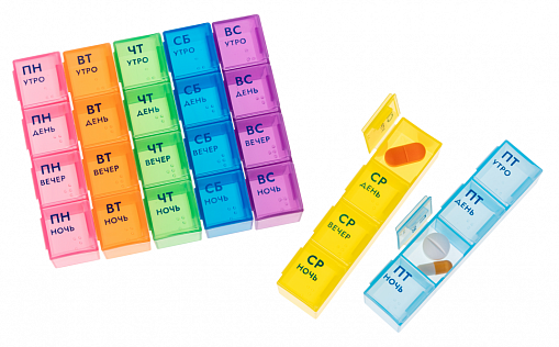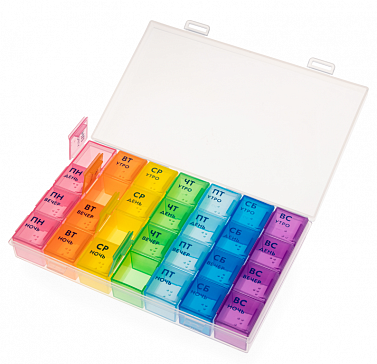 Содержит 7 отдельных контейнеров, которые соответствуют дням недели. Каждый контейнер состоит из 4 отделений для распределения лекарств в соответствии с суточным режимом приема: утро, день, вечер и ночь. Для людей с ослабленным зрением нанесены символы Брайля.