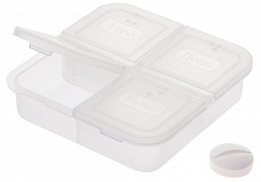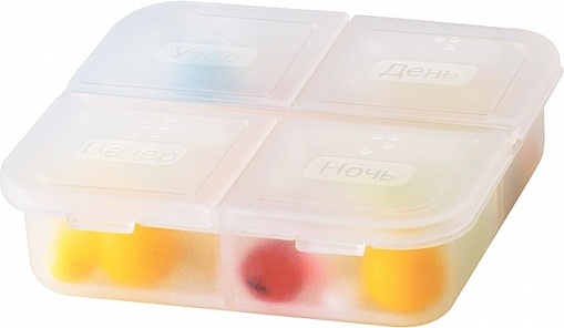 Состоит из 4-х отделений для распределения лекарств или витаминов в соответствии с суточным режимом приема: утро, день, вечер, ночь.