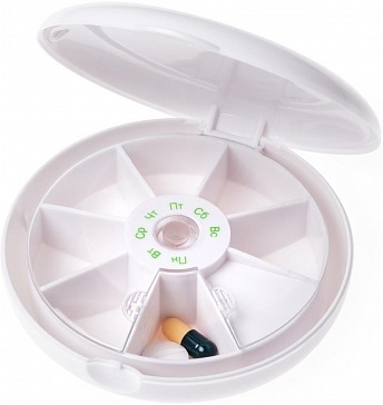 Содержит 7 отделений, которые соответствуют дням недели. Имеет прозрачную вращающуюся крышку.