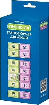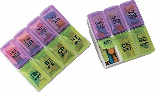 Описание: Состоит из 7 отсеков, которые соответствуют дням недели, а также имеют 2 отделения в соответствии с суточным режимом приема: утро и вечер. Любой отсек с определенным днем недели для удобства можно отсоединить.