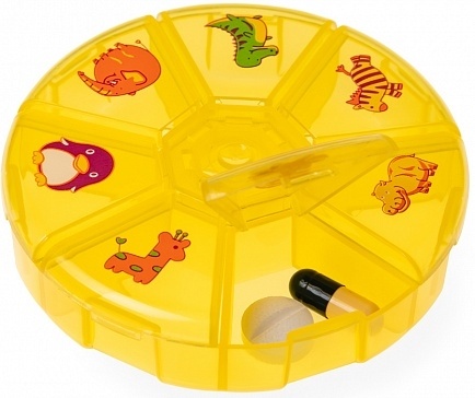 Яркий дизайн таблетницы ВИТАМИНКА разработан специально для детей и будущих мам. Имеет 7 отделений, крышка каждого из которых украшена изображением забавного животного.