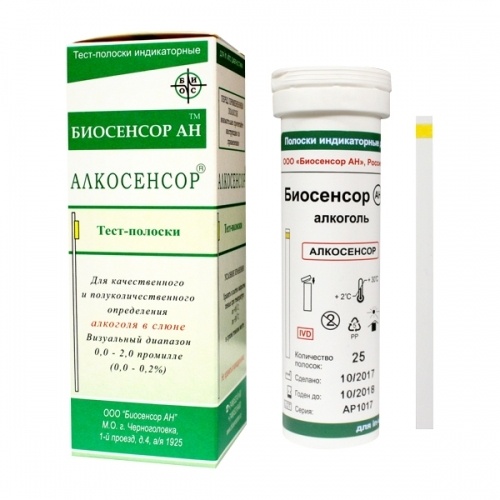 Полоски индикаторные АЛКОСЕНСОР предназначены для быстрого визуального качественного или полуколичественного определения алкоголя в слюне человека. Они могут быть использованы для скрининга и оценки содержания алкоголя в организме человека.